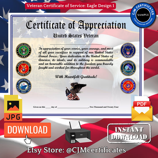 You can design your own military certificates with Corjl, download, and print. Also Visit Our Etsy Store for Instant Downloaded Certificates in JPG and PDF with Unlimited Prints. As Soon as You Purchase on Etsy, You Receive the Certificate Files.