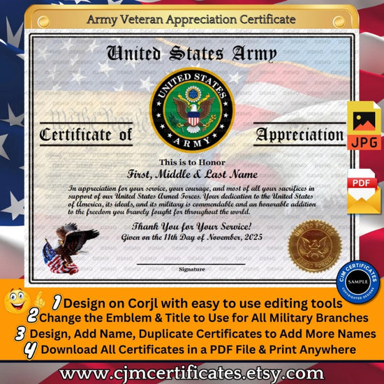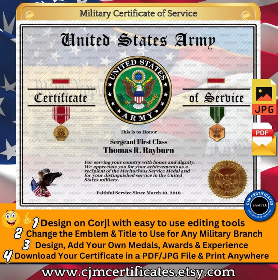 US ARMY MILITARY SERVICE CERTIFICATEPurchase Your Certificate Template - Customize Your Certificates in CORJL - Download & Print