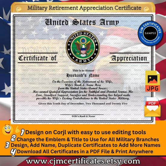 US MILITARY RETIREMENT CEREMONY-HUSBAND APPRECIATION CERTIFICATEPurchase Your Certificate Template - Customize Your Certificates in CORJL - Download & Print