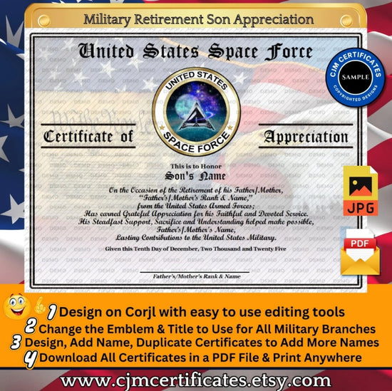 US MILITARY RETIREMENT CEREMONY-SON APPRECIATION CERTIFICATEPurchase Your Certificate Template - Customize Your Certificates in CORJL - Download & Print