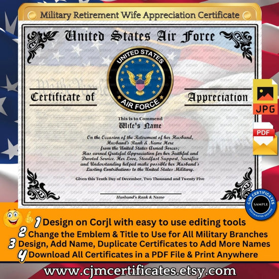 US MILITARY RETIREMENT CEREMONY-WIFE APPRECIATION CERTIFICATEPurchase Your Certificate Template - Customize Your Certificates in CORJL - Download & Print