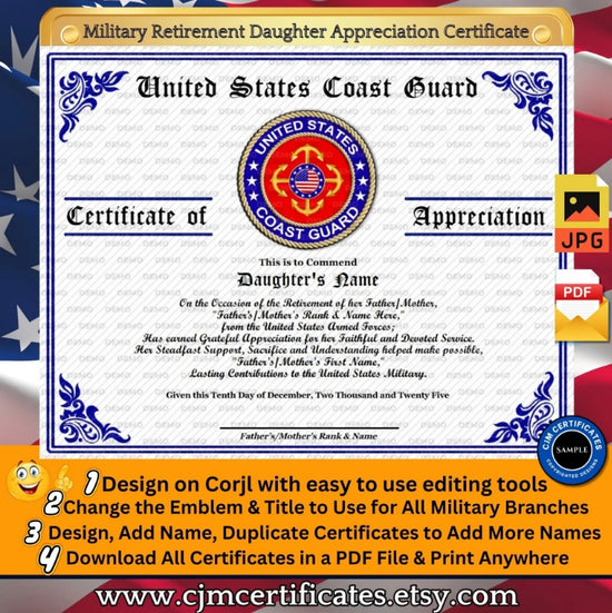 US MILITARY RETIREMENT CEREMONY-DAUGHTER APPRECIATION CERTIFICATEPurchase Your Certificate Template - Customize Your Certificates in CORJL - Download & Print