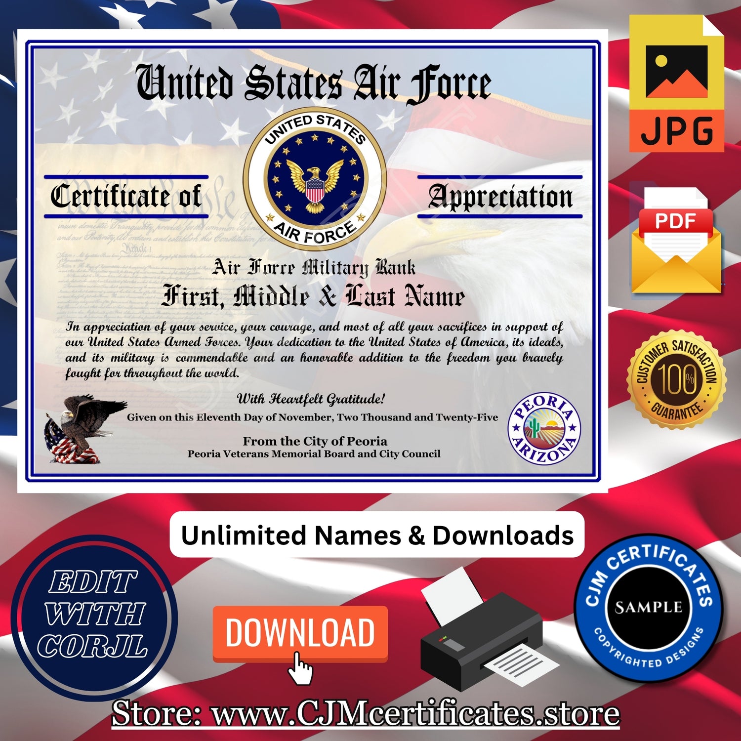 • These professionally designed, copyrighted certificates by CJM Military Certificates are intended for personal use in honoring military members and their families. Please note, they are not for resale.